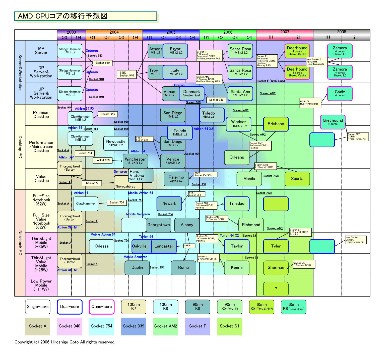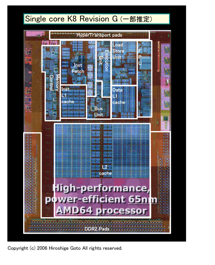이전의 칼럼에서 AMD가 2007년에 Rev. G까지의 CPU 코어 확장을 준비하고 있는 것을 보고했다. Rev. G로 보이는 65nm K8과 Rev. F에서는, CPU 코어의 다이 (반도체 본체)의 레이아웃이 명확하게 다르고 확장은 명백했다.