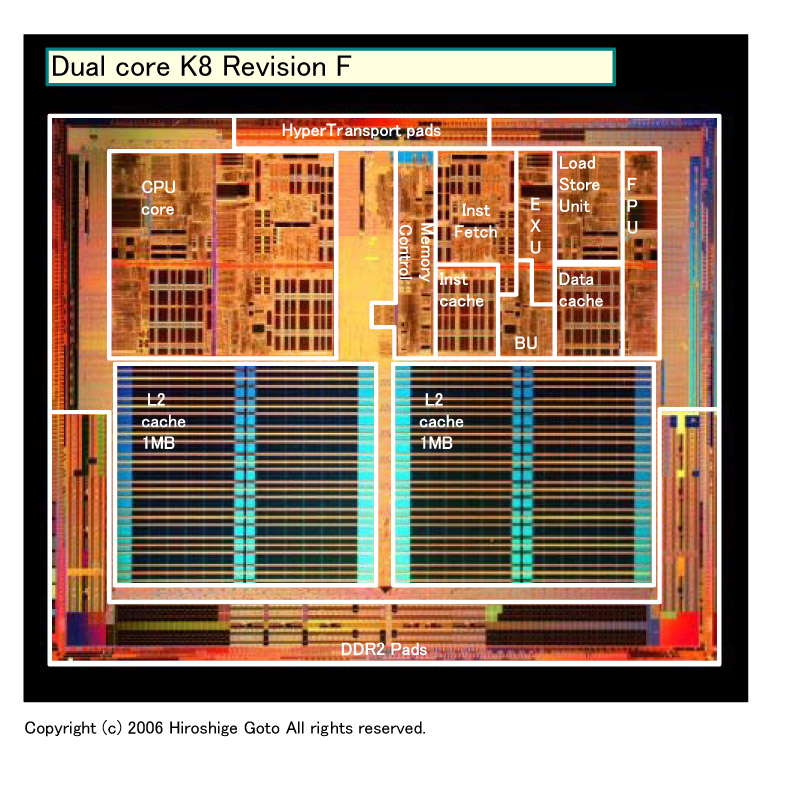 이전 리포트 한대로, Rev. F부터 Rev. G에서 K8은 다이 레이아웃이 처음 크게 바뀌었다. 다이를 보면, 명령어 페치 & 디코더가 확장되는 것이 명료하게 알게된다. 로드 / 스토어 유닛도, 내부의 배치가 바뀐 것처럼 보인다. 그러나 부동 소수점 연산 유닛에 대해서는 Rev. G와 Rev. F를 비교해도 상대적으로 동일한 정도의 크기 밖에 보이지 않는다. 유닛 면적 (= 트랜지스터)을 늘리지 않으면, 성능을 비약시키는 것은 어렵다.