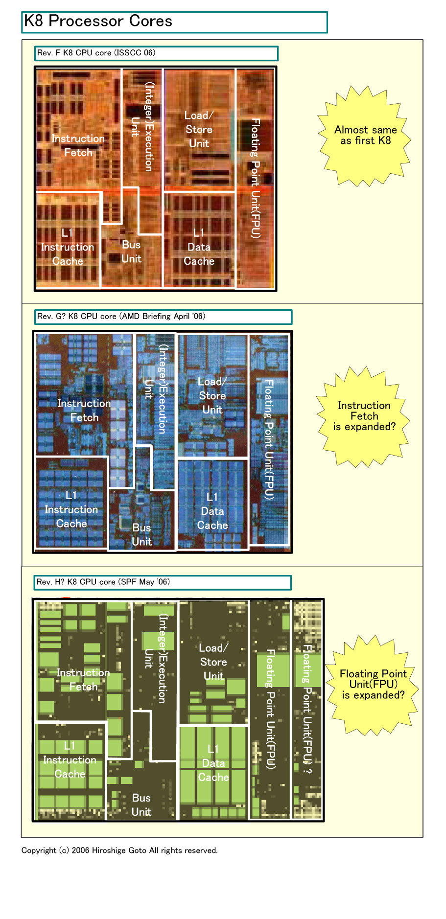 지금까지 AMD가 발표한 향후 3 세대의 K8 CPU 코어를 비교한 것이 아래의 그림이다. 맨 위는 2월의 반도체 학회 "ISSCC 2006"의 발표 자료를 기반으로 다이 사진에 각 유닛 블록의 구분을 쓰고 더한 Rev. F CPU 코어. 중간은 4월 AMD의 일본에서의 브리핑 자료에 추정되는 유닛 블록 구분을 더한 65nm CPU 코어. 이것은 Rev. G로 추정된다. 가장 아래는, 지난주 SPF 쿼드 코어의 자료에 추정되는 유닛 블록 구분을 더한 것. 일단 편의적으로 Rev. H로 했다.