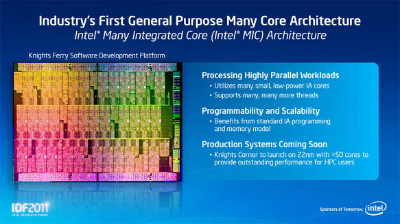 Rattner 씨는 연설에서, Knights Ferry의 경험을 살려, 다음 버전의 MIC 아키텍처 CPU를 정식 제품으로 출시한다고 밝혔다. 22nm 프로세스로 50 코어 이상을 집적하는 "Knights Corner (나이츠 코너)"가 첫 제품 버전 매니 코어가된다. 당연히 Knights Corner의 발표 자체는 이미 진행되고 있기 때문에 IDF에서 발표는 재확인에 지나지 않는다.