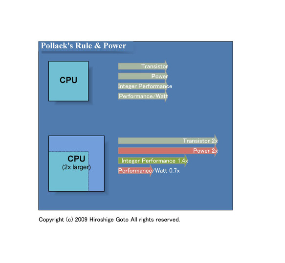 초대 Larrabee는 긴 벡터 연산 유닛에 대해 일반적인 스칼라 연산 파이프는 2 명령어의 Pentium 파이프라인 이었다. Intel은 Larrabee의 후속 CPU는 스칼라 파이프를 Atom 계의 Silverthorne (실버손 : 아톰) 아키텍처로 대체 예정이었다. MIC도 기본 아이디어는 동일, 스칼라 파이프는 낮은 성능 구성이되고 있는 것으로 보인다. 이것은 Intel의 CPU 설계 경험의 토대인 "폴락의 법칙 (Pollack 's Rule)" 에서 CPU의 크기를 2배로 해도 정수계 연산 성능은 제곱근 정도 밖에 향상하지 않기 때문이다. 따라서 CPU 코어를 작게하는 것이 전력당 성능 효율이 향상된다. 매니 코어의 기본적인 발상은 코어를 작게하면서 벡터 연산 성능을 높이는 점에있어, 그 의미에서는 GPU 모두 공통점이있다.