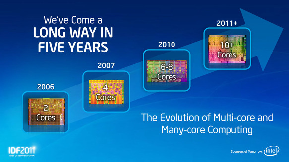 "2 코어에서 4 코어가 태어나고, 4 코어에서 8 코어가 태어나 지금 우리는 매니 코어 시대의 시작에 있다. 더욱 더 많은 코어를 제공한다."