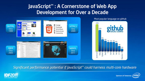 따라서 Intel이 멀티 / 매니 코어 화를 추진하는 경우에는 Web 프로그래밍 세계에서 쉽게 다수의 CPU 코어를 사용할 수있게하는 방법이 필수적이다. Rattner 씨는 이번 그러한 흐름에 따른 연구에 Intel이 적극적으로 참여하고있는 것으로 나타났다. 그러나 이 프로젝트는 OpenCL로 처리되기 때문에 Intel 전용 만의 솔루션이 아닌 범용적인 솔루션이다.