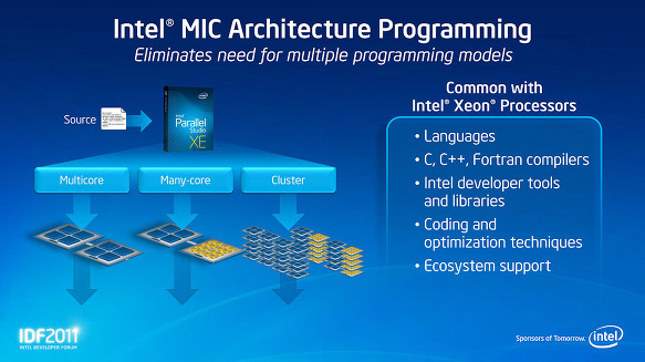 MIC 소개에서 Rattner 씨는 Intel의 이기종 (Heterogeneous : 이종 혼합) 컴퓨팅이 타사의 방식과는 본질적으로 다른 것을 강조했다. "업체 중에는 GPU와 같은 특정 애플리케이션 프로세서 작업의 일부를 수행한다"(Rattner 씨) 그러나 Intel의 "Knights 제품군과 MIC 아키텍처는 기본적으로 매우 일관된 프로그래밍 모델을 제공한다. 예를 들어, Xeon 등의 프로그래밍에 익숙하다면, 아주 쉽게 MIC 코어를 프로그램 할 수있을 것 "이라고 말한다.