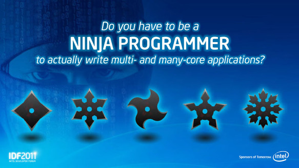그렇다고는 해도, 매니 코어 프로그래밍의 장벽은 높아 폭 넓은 보급은 기대할 수 없다. 슈퍼 컴퓨터 수준의 방대한 병렬 코어의 프로그램은 매우 숙련 된 프로그래머만 가능하다는 이미지가 강하다.Rattner 씨는 그러한 프로그래머 '닌자 프로그래머 "라고 불렀다. 그 뒤에, 매니(MIC) 코어 프로그래밍은 닌자 프로그래머일 필요는 없다고 강조했다.