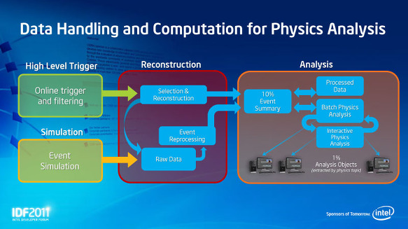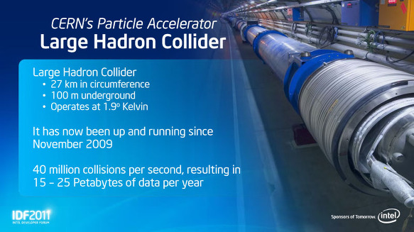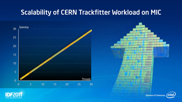 MIC 아키텍처는 엄청난 연산을 필요로하는 응용 프로그램을 극적으로 가속화 할 수있다. Rattner 씨는 그러한 응용 프로그램의 예로 CERN의 (유럽원자핵 공동연구소) LHC 강 입자 가속기에서 실험 결과의 분석을 소개했다. IDF의 단상에 CERN의 openlab의 Andrezj Nowak 씨가 등장, LHC는 초당 4,000 만 번의 충돌이 발생, 그결과 매년 15 ~ 25PB (페타 바이트)의 데이터 분석을 할 필요가 있다고 설명했다 . 따라서 CERN에서는 25 만 Intel CPU 코어를 분산 된 노드에서 가동하고 있다고 한다.