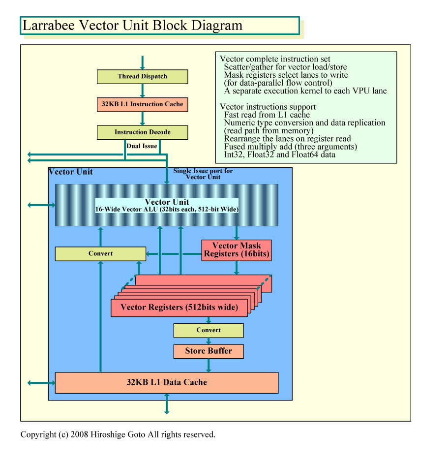 MIC 아키텍처를 쉽게 프로그래밍 할 수있는 이유는 Larrabee (라라비) 명령어 세트 확장을 구현한 작은 IA (x86) CPU 코어를 집적 한 매니 코어이기 때문이다. Intel CPU의 프로그래밍에 익숙한 경우, 확장 명령만 대응하면 MIC를 프로그램 할 수있다. MIC는 성능 향상을 위해 각 코어가 512-bit 폭의 벡터 실행 파이프 라인을 갖추고있다 (Sandy Bridge의 AVX는 256-bit 폭). 아래는 Larrabee 때 벡터 파이프 라인이다. MIC에도 벡터 파이프의 기본 구조는 크게 다르지 않다고 볼 수있다.