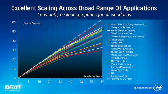 아래의 그래프는 응용 프로그램의 종류마다 CPU 코어 수에 따라 얼마나 성능이 향상되는지를 보여준다. Rattner 씨는 게임이나 비디오 말했다 일반 응용 프로그램을 포함하여 많은 소프트웨어가 64매니 코어에서 30 배 이상의 성능 향상을 얻을 수 있음을 보여 주었다.