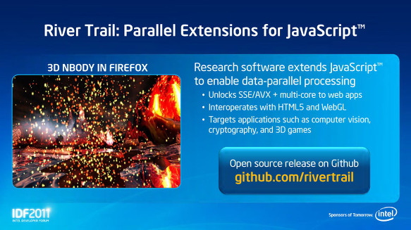 Rattner 씨가 쉽게 매니 코어 프로그래밍있는 예로 거론 한 것은 JavaScript에서 멀티 / 매니 코어 프로그래밍을 가능하게하는 프로젝트 "River Trail (리버 트레일)"이다. River Trail은 JavaScript를 병렬 프로그래밍 확장 오픈 소스 프로젝트이다. Rattner 씨의 키 노트 스피치에서 JavaScript를 낳은 부모 인 Brendan Eich 씨 (CTO Mozilla)가 등장. "JavaScript는 지금까지 순차 (프로그램)을 위한 유력한 언어 였지만, 우리는 이것을 멀티 코어 하드웨어의 기능을 최대한 살릴 것으로 하고 싶다고 생각하고 있다"고 말했다.