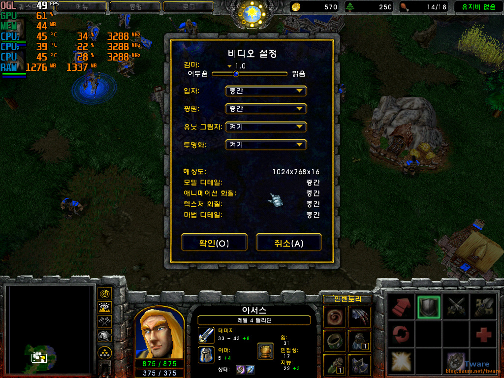 바이오스 메모리 333설정. 내장 GMA 950. 워3 -opengl 실행. 1024x768x16.