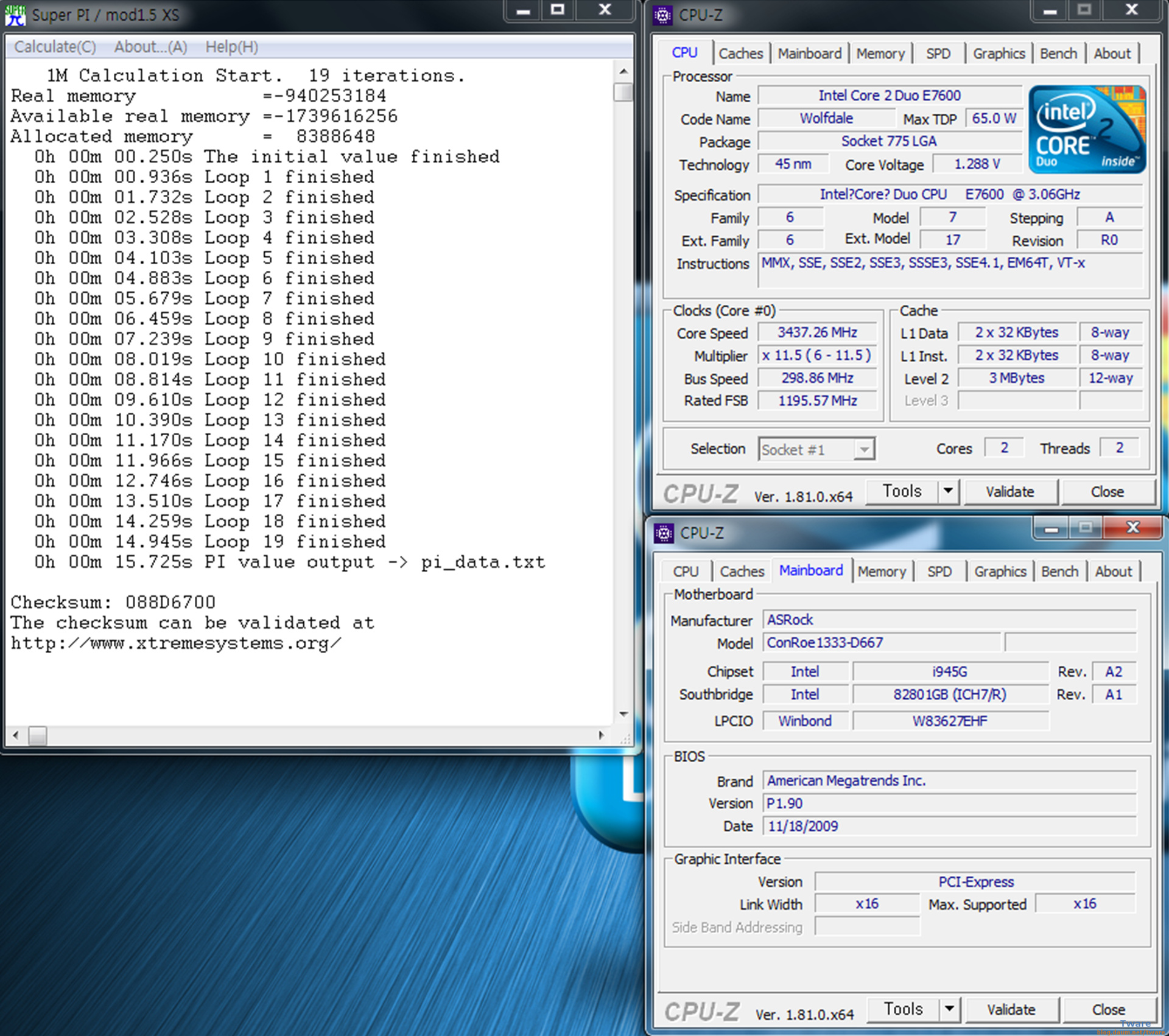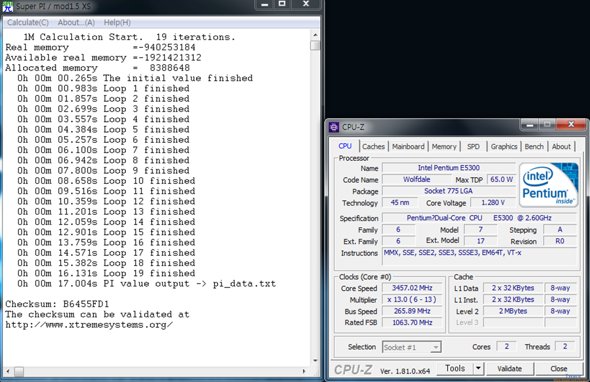 E5300 오버 3.457Ghz 슈퍼파이. (아주 짧은 시간이라도 저 클럭 상태로 돌리지 않기 위해 최소 프로세서 100% 설정. CPU-Z는 연산 후 실행.)