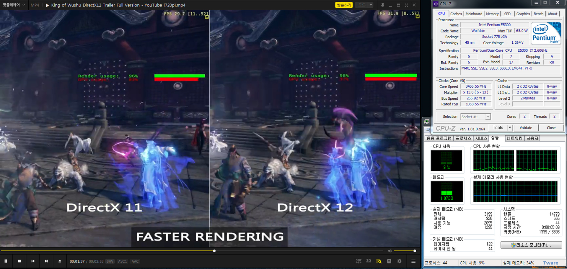 최소 프로세서 상태를 기본 5%로 두면 최소 배수인 6배수 x 266 (은박오버) = 1596Mhz로 돌아 갑니다. 장면에 따라 2Ghz 대로 잠시 올라가기도 하구요. CPU 이용률은 당연히 더 높게 나옵니다. 동영상을 돌리는데 300의 힘이 필요하다면, 3000의 힘을 가진 CPU로 돌리면 10%면 되겠지만, 1500의 힘을 가진 CPU로 돌리면 20%의 힘이 필요 하겠죠.