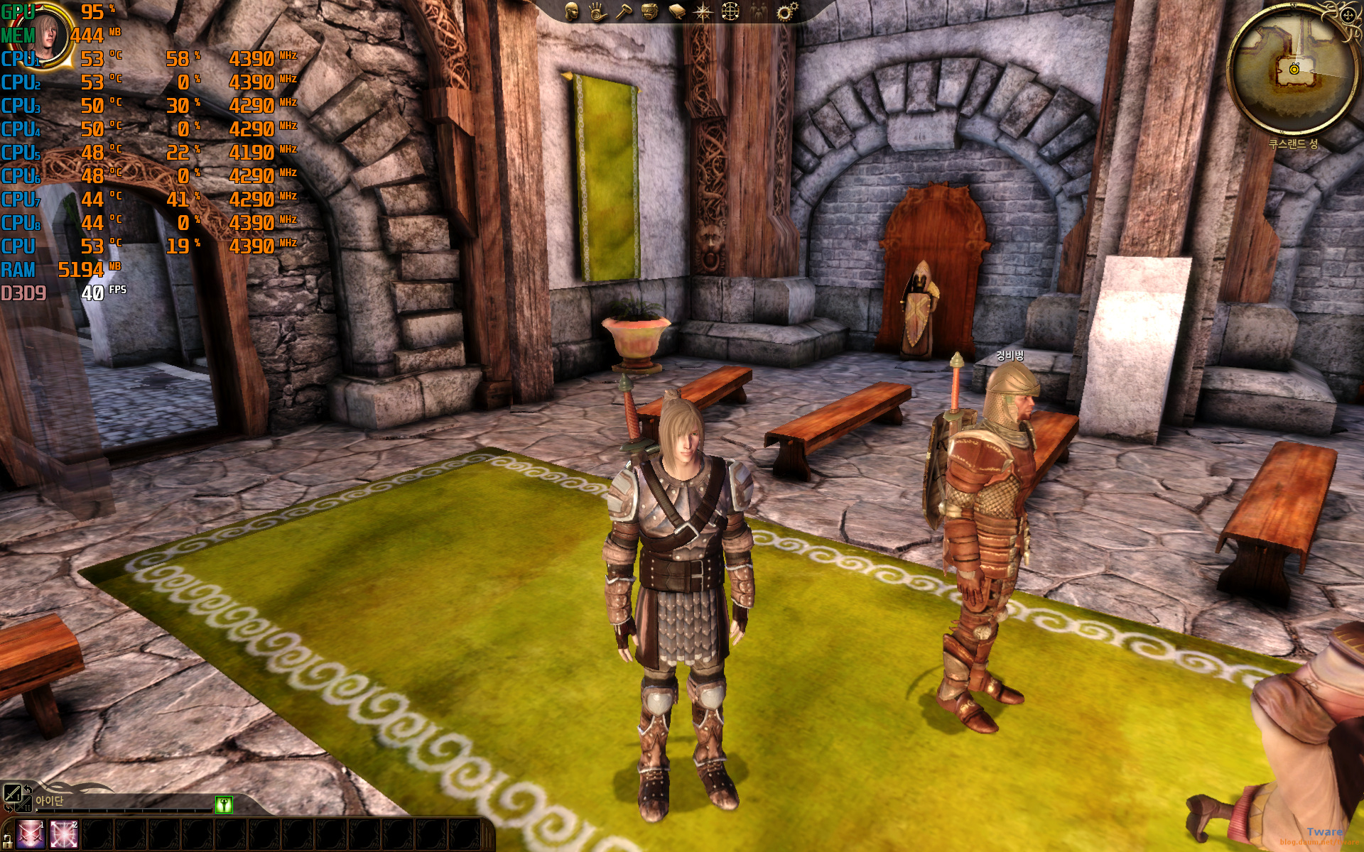 참고로 i7 4790K 내장 HD4600 으로 돌린 드래곤 에이지 오리진 프레임. (내장 그래픽 클럭 기본 1250Mhz -> 오버 1400Mhz. 내장 그래픽 전압 auto (기본값). 그래픽 전압을 높이면 더 높은 클럭도 가능하나 온도가 높아 집니다. 반대로 내장 그래픽 사용을 안하면 온도가 약간 더 낮아집니다. 쿨러는 지금은 단종 된 제로썸 1만원 중반대 사제 쿨러.)