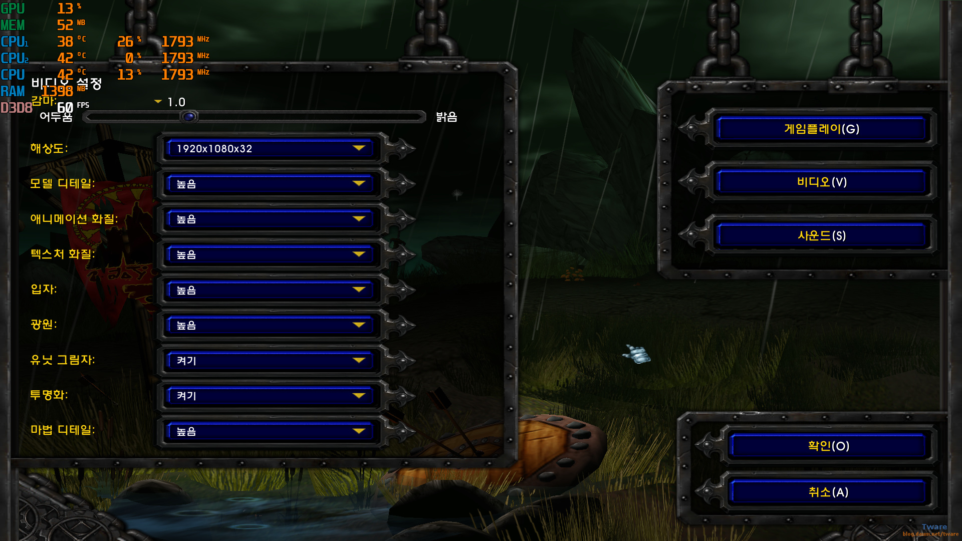 바이오스 메모리 auto 설정. 내장 GMA 950. 워3 위와 동일 32비트 컬러.