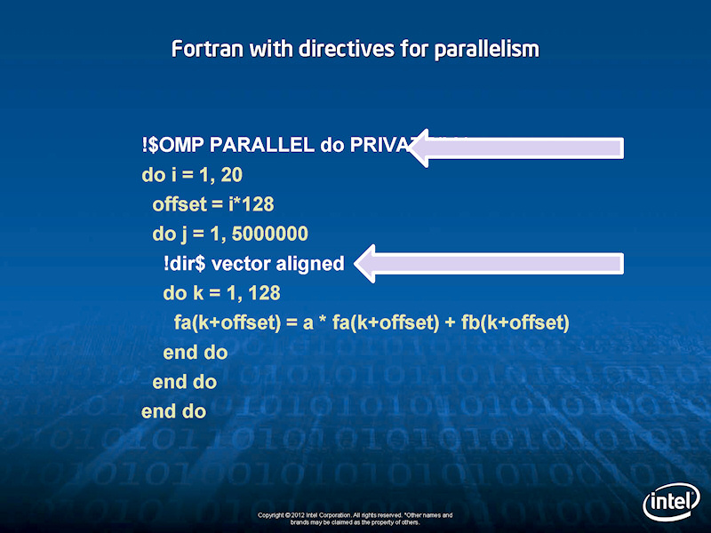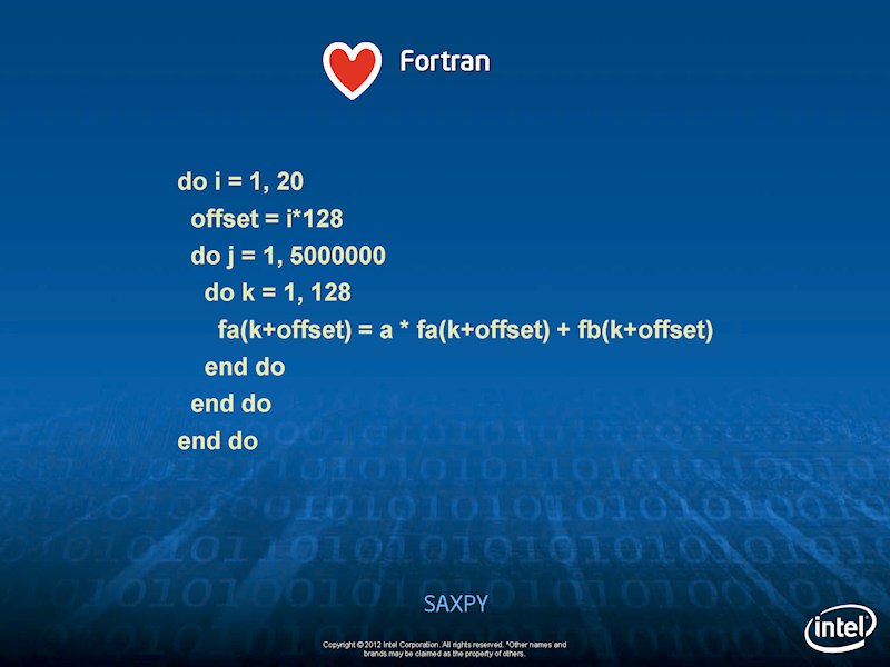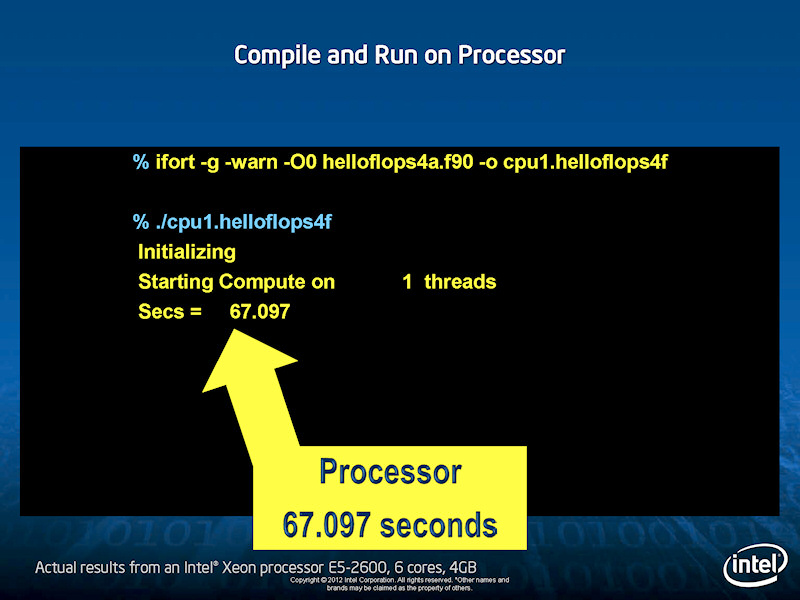 Reinders 씨는 간단한 행렬 연산 SAXPY (Single-precision real Alpha X Plus Y)를 FORTRAN 코드 비교. 먼저 일반적인 컴파일로 달리게 하면 처리 시간이 67 초 (Xeon E5-2600 6 코어)이 되는 것으로 나타났다.