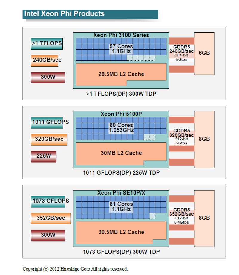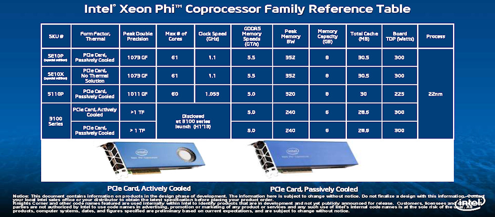 Intel이 출시한 Xeon Phi 제품은 5100 계와 3100 계의 2 제품군. 모두 22nm 공정으로 동일한 다이(반도체 본체)에서 파생시키고있다. 모두 PCI Express 카드의 형태로 데이터 센터를 위한 패시브 냉각 카드와 팬이 있는 액티브 냉각 카드 2가지 형태가 있다. 데이터 센터에서는 랙 단위로 냉각하기 때문에 일반적으로 칩에 냉각 팬이 없다.