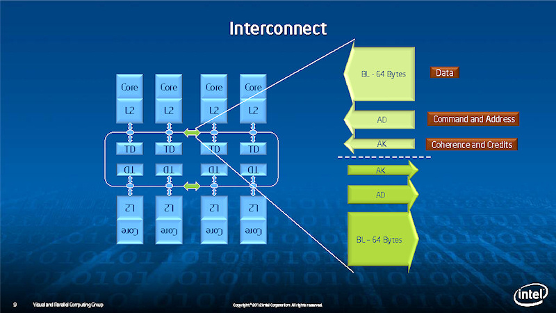 Knights Corner의 62개의 CPU 코어와 각 I / O 장치는 링 버스로 연결되어 있다. 링 버스에 CPU 코어와 L2 캐시 쌍과 GDDR5 메모리 컨트롤러, PCI Express 버스가 연결되어 있다.링은 양방향 단방향 독립된 3가지 형태가 있다.