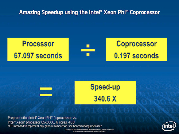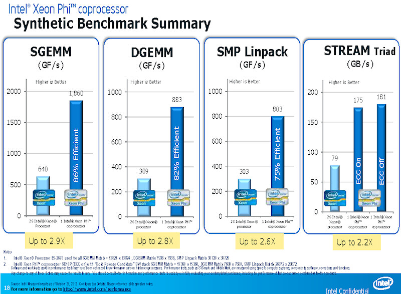 Intel은 단일 노드에서의 성능을, Xeon 및 Xeon Phi에서 비교한 결과도 공표했다. 동렬의 소비 전력비교, Xeon 측은 Xeon E5-2670을 2 소켓 구성, Xeon Phi 측은 Xeon Phi SE10P 단일 구성 (Xeon Phi가 연결되는 Xeon 성능 제외)의 성능 비교와 되고있다. 실제로 Xeon Phi 카드는 Xeon에 연결되어 있지만, Xeon Phi 자체의 성능을 비교하고 있다.