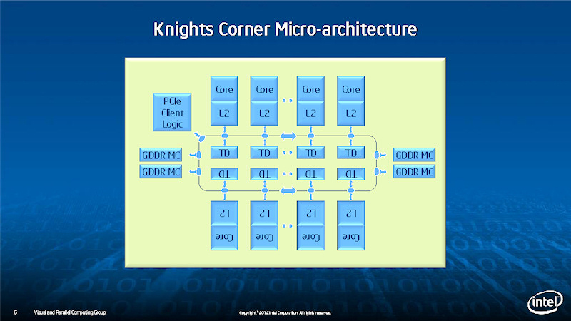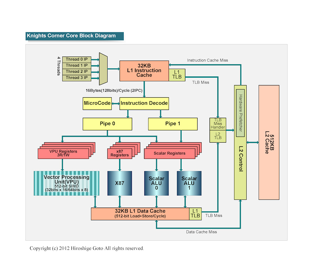 흥미롭게도, Knights Corner에서도 CPU 코어 사이에 정체 불명의 유닛이 8 개 정도 배치되어 있다. Intel의 링 버스는 L2 캐시에 연결되어있을 것이므로, CPU 코어에 끼워진 장치도 링 버스에 연결되어 있는 것이다. 위치를 보면 I / O 계 유닛이 아닌 텍스쳐 유닛의 수로 많다. Intel은 "Knights Corner는 그래픽 전용 유닛은 싣고 있지 않다"라고 설명하고 있지만, 실제로 설치되어 비활성화 되어 있는 것으로 보인다. Knights Corner에도 여전히 텍스처 유닛이 탑재되어 있다고 하면, Intel은 MIC 아키텍처의 그래픽시장에 투입 가능성을 아직 버리지 않게된다.