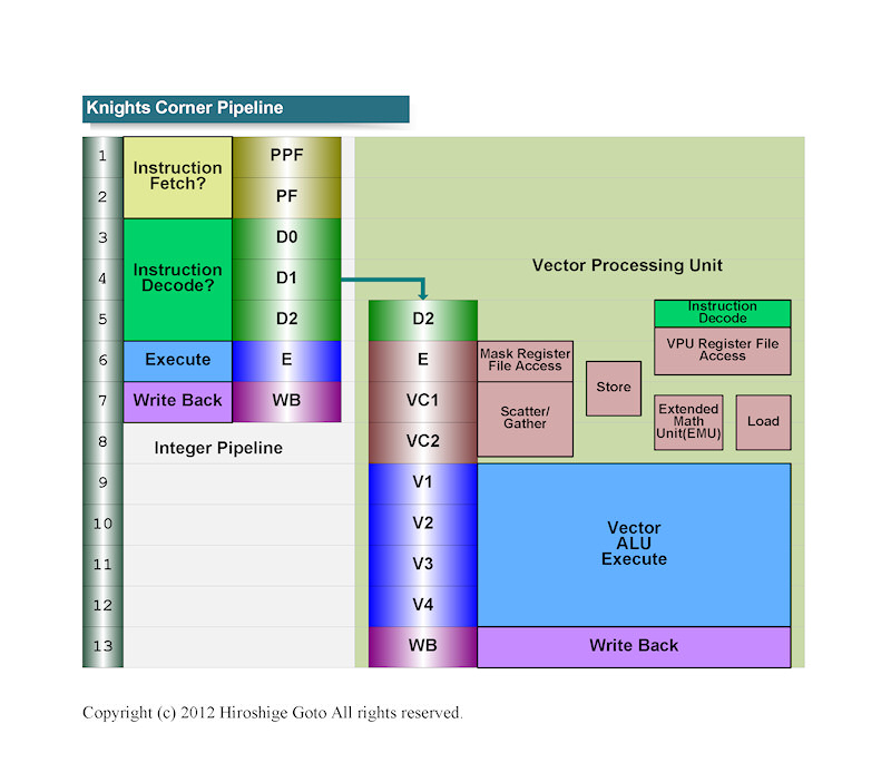 프로세서 파이프 라인은 매우 얕고, 정수 연산 7단계. PC용 CPU 코어와 비교하면 절반 이하로 그만큼 동작 주파수의 상한은 낮다. Knights Corner는 1GHz를 약간 넘는 정도의 주파수에서 작동하는 것을 목표로 하고 있다. 매니 코어를 통해 성능을 향상하면서 주파수는 낮춰 전력소비를 억제하고 있다.