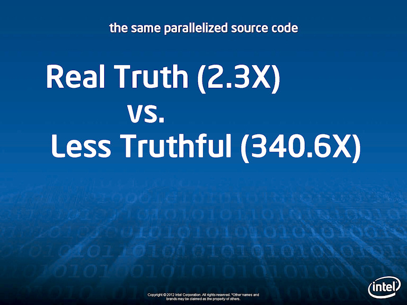 또한 Reinders 씨는 Intel Xeon Phi는 2.x 배의 성능 향상을 지시문을 더하는 것만으로 얻을 수 있기 때문에 핸드 코딩 최적화가 필요하지 않아 프로그래밍 효율이 높다고 설명했다. Intel은 이 연구논문도 발표하고, GPU의 극적인 성능 향상은 허구라고 반박하고있다. 또한 Intel은 Xeon Phi의 장점은 단독으로 스칼라 코드와 벡터 코드를 모두 실행할 수있는 것을 강조하고 있다.