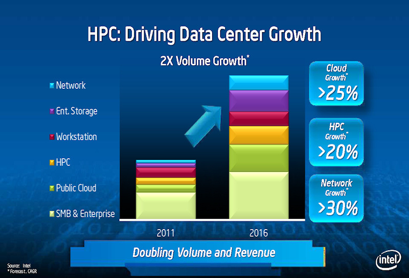 Intel은 HPC의 성장이 데이터 센터의 성장을 견인하고 있다고 보고 있으며, HPC 시장을 중시하고 있다. 또한 Intel은 빅 데이터 분석의 필요성이 높아지는 것으로, 매니 코어의 수요가 향후 높아질 수도 있다고 예측한다. 매니 코어 프로세서와 같은 높은 병렬 프로세서가 제한된 현재 HPC 시장뿐만 아니라 더 넓은 시장에서 사용되어 간다는 것이 Intel의 비전이다. 보통 데이터 센터에, 매니 코어의 Xeon Phi가 들어가게 되면 매출도 커지고 프로세서 개발비도 상각하기 쉬워진다.