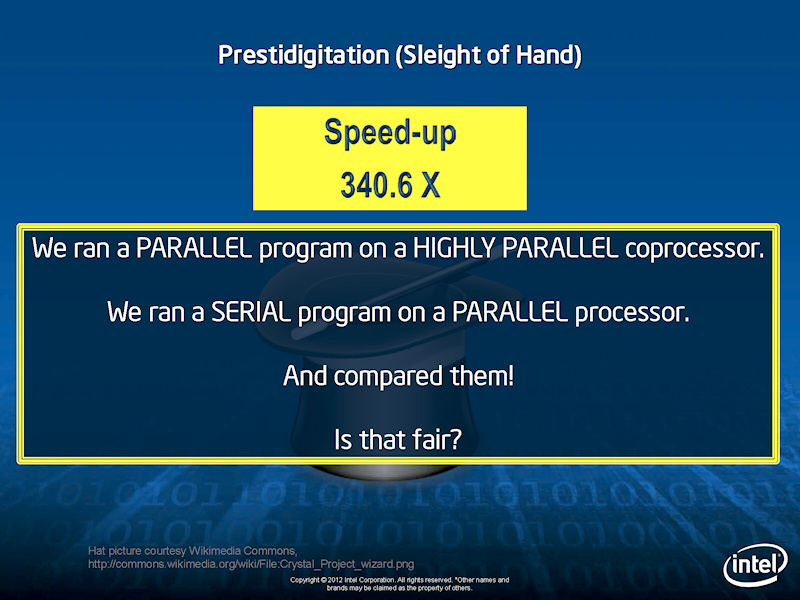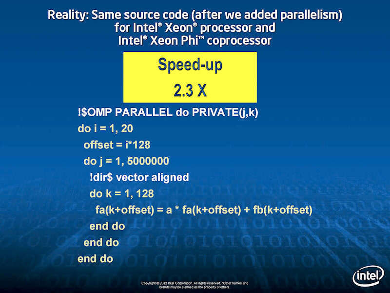 그 뒤에 Reinders 씨는 같은 병렬화 지시어를 추가하여 컴파일 된 코드를 Xeon에서 달리게 했다. 그 결과를 Xeon Phi과 비교하면 2.3 배의 성능 향상 밖에되지 않는다고 Reinders 씨는 지적. Xeon Phi 같은 높은 병렬 프로세서의 성능 향상은 실제로 2.x 배가 된다고 설명했다. (이게 더 맞는 거겠죠. CPU에도 최적화한 코드랑 GPU랑 비교해야지 맞지, 그렇지 않게 해놓고 GPU랑 비교해서 GPU가 100배 속도라고 말하면 속임수죠. 실제 이런 100배 차이라면, GPU를 쓰지 않고 순수 CPU만으로 구성된 슈퍼컴퓨터는 순위에도 없거나, 있어도 엄청난 격차가 있어야 하지만 그렇지 않죠.)
