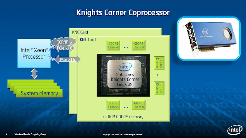 Intel이 "Xeon Phi 5110P"의 브랜드로 투입한 "Knights Corner (나이츠코너)"는 22nm 공정에서 물리적으로 62 개의 CPU 코어를 탑재하는 매니 코어 프로세서이다. 1 칩으로 단정밀도(32비트)부동 소수점 연산이라면 2TFLOPS 이상 배정밀도(64비트) 1TFLOPS 이상의 성능을 달성한다. 칩당 성능은 하이 엔드 GPU 수준이면서 CPU 형의 명령어 세트를 갖춘 하이브리드 프로세서인 점이 특징이다. 아키텍쳐적으로 시장출시를 취소한 그래픽 전용 제품 "Larrabee (라라비)"를 계승한 "MIC (Many Integrated Core)" 아키텍처다.