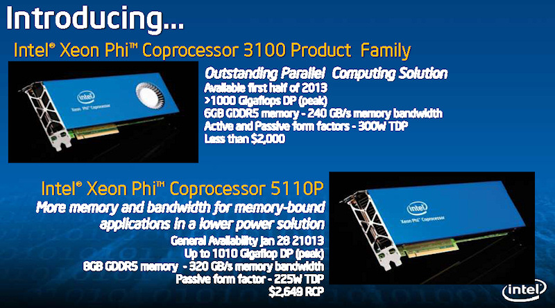 상위 Xeon Phi 5100 계는 패시브만, 현재는 "Xeon Phi 5110P"의 1 모델. Xeon Phi 5110P는 현재 특정 고객에게 출하되고 있으며, 내년 (2013 년) 1월 28일 부터 일반에 발매된다. 카드 가격은 2,649 달러.
