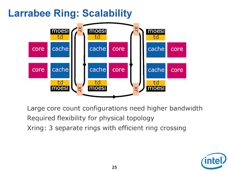 하지만 실제로는 링 1쌍 양방향 링에서 62개의 코어를 모두 연결하고 있는 것은 아니다. "소프트웨어 측면에서 보면, 링은 하나다. 하지만 물리적으로 여러개의 연결로 구성되어 복잡하다. 자세한 내용은 말할 수 없지만, 링의 구성은 최적화되어 있으며, 트래픽을 효율적으로 제어하고 있다. 또한 지연 시간은 (메모리 에서 캐시) 프리 페치 플레잉에서 은폐하고 있다 "라고 Intel은 설명한다. 덧붙여서, Intel은 Larrabee 아키텍처 발표 때 향후 확장으로 아래와 같은 복잡한 고리 구조를 발표했었다.
