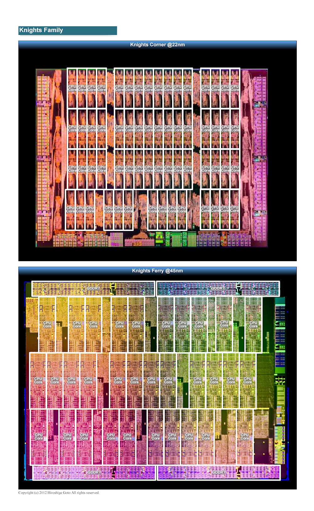 Knights Corner는 다이에 총 62개의 CPU 코어가 배치되어 있는 것을 알수 있다. 4단계 구성으로, 그림의 상단에서 3단까지 각각 16코어씩, 더 하단에 14코어의 총 62코어다. 반면 Knights Ferry 의 CPU 코어수는 32코어 약 절반이다. Knights Corner와 Knights Ferry의 모두 양품으로 사용되는 CPU 코어 수가 물리적 코어 수보다 적은 것은, 수율 향상을 위해 중복을 갖기 때문이다. 여러 CPU 코어에 결함으로 제대로 작동하지 않는 CPU 코어가 있어도 그 코어를 비활성화 하여 제품으로 출하 할수 있다.