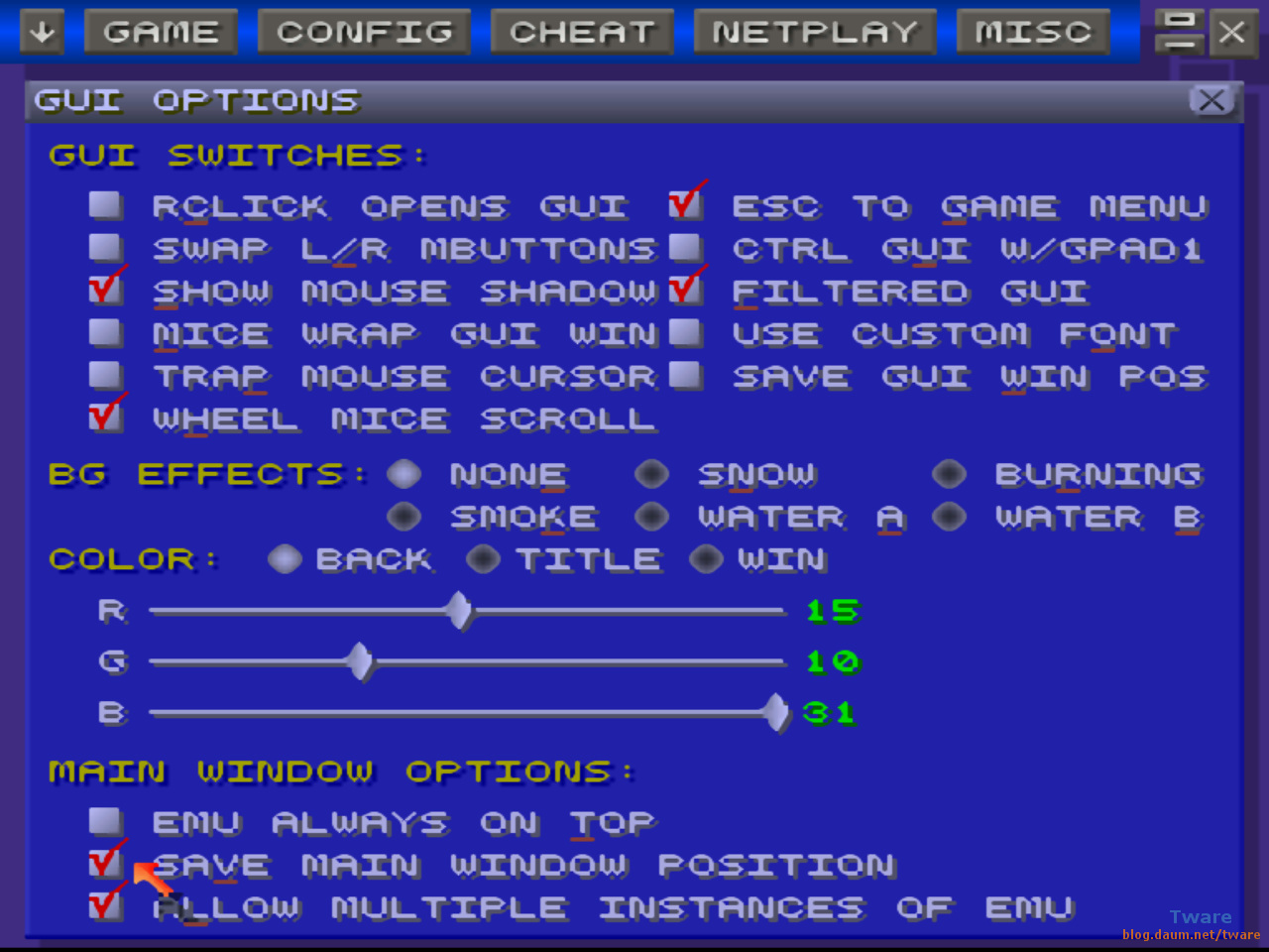 옵션을 다 초기화 하는 방법은, zsnes 폴더안의 .cfg 파일들을 삭제하고 zsnes를 실행하면 됩니다. 삭제후 재 실행 하면 cfg 파일이 자동으로 생성되며, 초기화 됩니다. 이후에 에뮬레이터의 그래픽 사운드 등등 옵션을 바꾸면 zsnes.cfg 파일에 내용이 저장되며, zsnes.cfg 파일을 메모장으로 열어서 직접 옵션을 바꾸고 저장해도 됩니다. ZSNES를 구버전부터 다양한 하드웨어와 운영체제에서 쓰면서 특별히 문제가 되는 것을 본적이 없었는데 (윈98SE 에서도 아주 잘 되구요. 리눅스에서도 잘 됩니다. 절묘하게 상대적 신형 하드웨어에서 신형 윈도우로 옮겨가며 써서 그런것 같구요. 또 ZSNES도 버전 업이 2007년이라 비스타 쓰고 그런 시대였죠. 구형 드라이버에서는 문제가 없었던 것 같기도 한데, 구형 드라이버는 윈도우 해상도를 제대로 잡지 못하는 문제가 있습니다.), 그런데 윈도 XP에서 지금으로 보면 구형인 장비들을 써보니까 HQ 필터 옵션을 바꿀 때 ZSNES가 꺼지는 것을 경험했습니다.