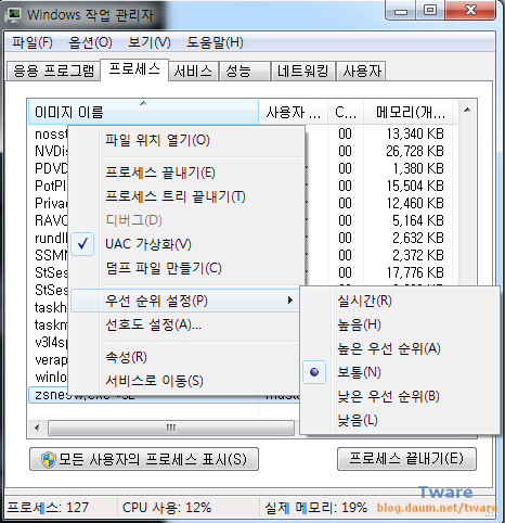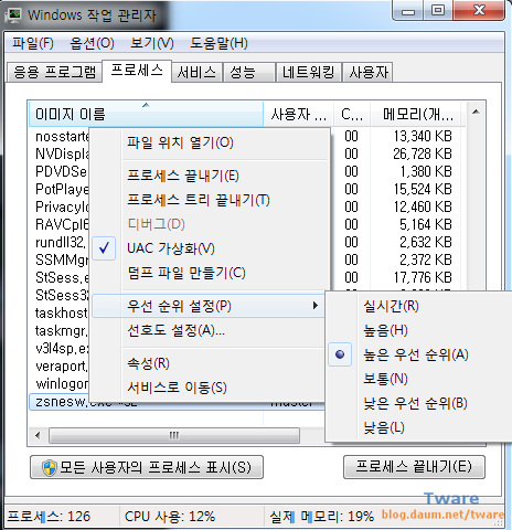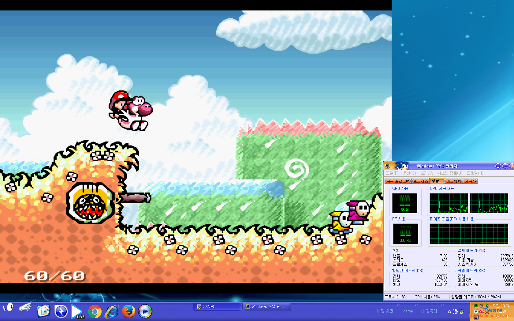 (4장의 펜티엄4 3.2c 화면은 모두 게임 플레이 중 화면 입니다. 작업관리자 창이 위냐 아래냐는, 작업관리자 옵션 "항상 위에 표시" 의 차이 입니다. 시스템에 따라서 (보통 구형 시스템) Vsync 나 필터 옵션 등을 바꾸고 난 뒤에 지지직 소리가 난다거나, 느려지는 현상이 생기면, 바꾸고자 하는 옵션을 선택하고, ZSNES를 껐다가 다시 켜서 해보세요. 그러면 문제 없습니다.)