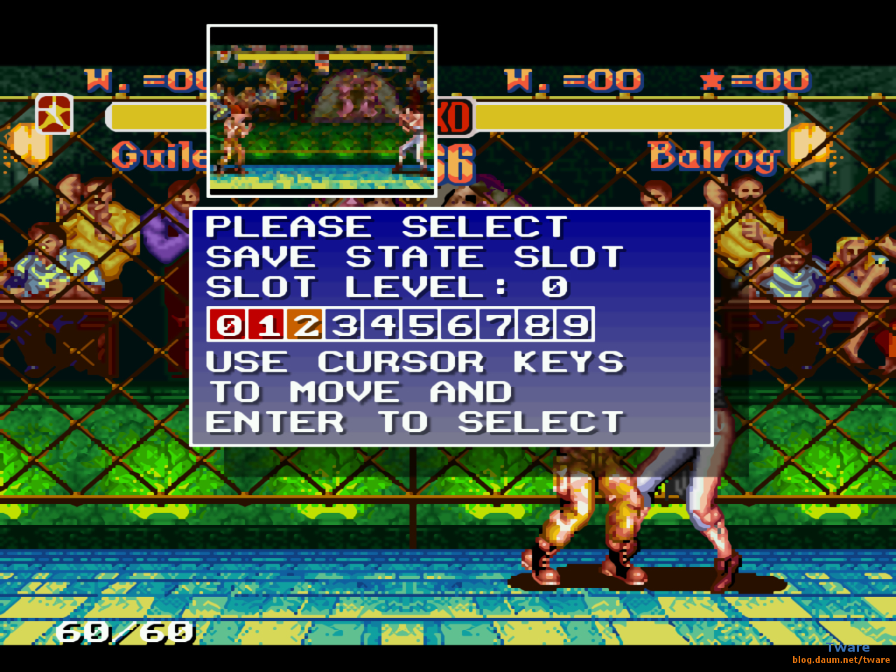 각 세이브 마다 저장된 화면이 보이기 때문에 SNES9x에 비해서 세이브 관리가 더 쉽습니다. (위 그림에도 실제 게임 화면은 가일과 발로그(일본판 이름. 기타지역 베가)가 붙어 있지만, 게임 강제 세이브의 저장된 화면에는 가일과 발로그가 서로 떨어져 있는 화면이죠.)