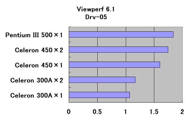 Windows NT 4.0을 멀티 프로세서 환경으로 도입하면, Celeron 1개 분리해도 부팅된다. 그래서 각각의 상태에서, Dual CPU 대응의 벤치마크 테스트를 진행해 보기로 했다. 평가는 HDBENCH (EP82 개 / 카즈씨 작의 무료 소프트웨어)의 최신 α 버전인 Ver.3.00α2 와 Ziff-Davis, Inc 의 Winstone 99 Version 1.0 에 포함되어 있는 Dual Processor Inspection Tests 및 OpenGL 용 벤치 마크 테스트의 표준화 단체 OPC (OpenGL Perfomance Characterization Project)가 개발한 Viewperf 6.1을 사용했다. 다만 Winstone 99는 일본어 환경에서 작동하지 않기 때문에, Winstone 99만 영어 버전 Windows NT Workstation 4.0을 도입한 환경에서 테스트를 진행했다. 또 비교를 위해, Pentium III 500MHz에서도 동일한 테스트를 진행해 보았다 (역시 SL-68A는 Pentium III 대응의 것이지만, 필자의 환경에서는 Pentium III를 장착하면 부팅되지 않았기 때문에, Pentium III의 테스트는 ASUSTek의 P2B를 이용해 진행했다).