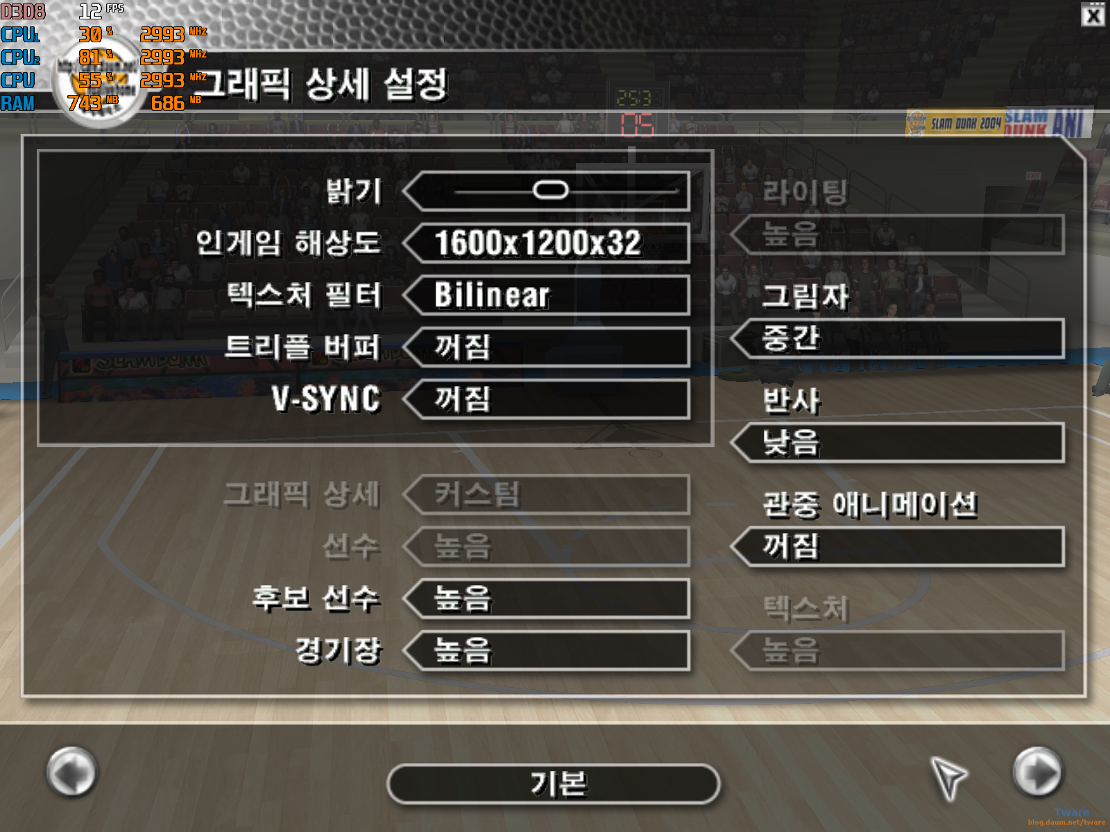 이보다 낮은 펜4 2.8 + 라데온 9600급 정도에서 관중 에니메이션 끄고, 보통 30 중반 정도 아래 위 프레임. 높음이 최대치가 아닌 "최고" 까지 있는 옵션의 경우는 "높음" 정도로 해도 품질에는 큰 차이가 없구요.