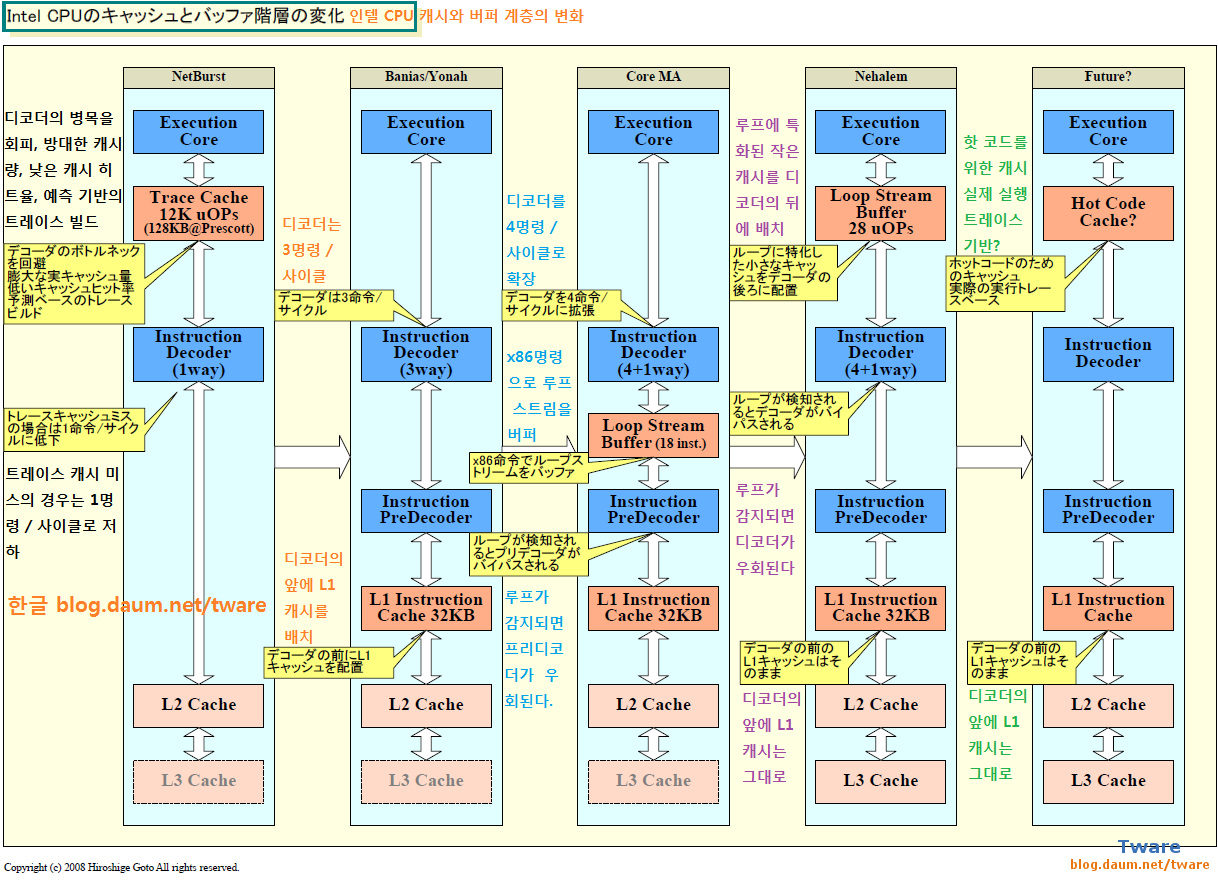 따라서 이 흐름이라면 논리적으로 예상되는, Intel CPU의 진화 방향성은 다음과 같다. 명령 디코더 아래에 배치하는 캐시를 한층 크게 한다. 보다 긴 루프나, 실행중인 루프 이외의 핫 코드도 감지해서 저장하도록 한다. 실제 명령 실행을 기반으로 하는 실행 트레이스를 캐시한다. 그러면 보다 많은 코드에 대해서, CPU의 프론트 엔드의 병목 현상을 회피시키는 것이 가능하다.