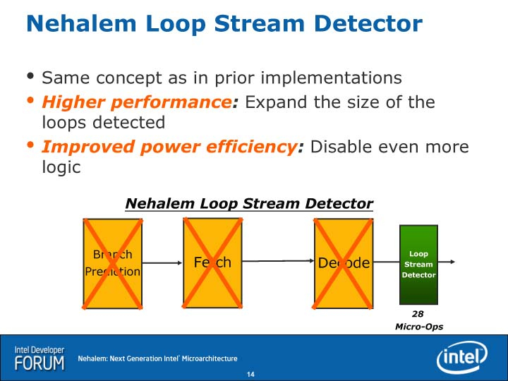 반면 Nehalem의 루프 스트림 디텍터는, 명령 디코더 뒤의 루프 스트림 디텍터가 있어, 루프 내의 uOPs를 최대 28 uOPs까지 캐쉬한다. 따라서 명령 디코더까지 우회 할 수 있다. Nehalem의 리드 아키텍트의 한 사람인 Ronak Singhal 씨 (Principal Engineer, Oregon CPU Architecture, Intel)는 명령 프리 디코드 & 디코드를 비용을 들여 개량하기 보다, 오히려 루프 스트림 디텍터 등 다른 해결책을 강구하는 쪽이 좋다고 판단했다고 말했다.