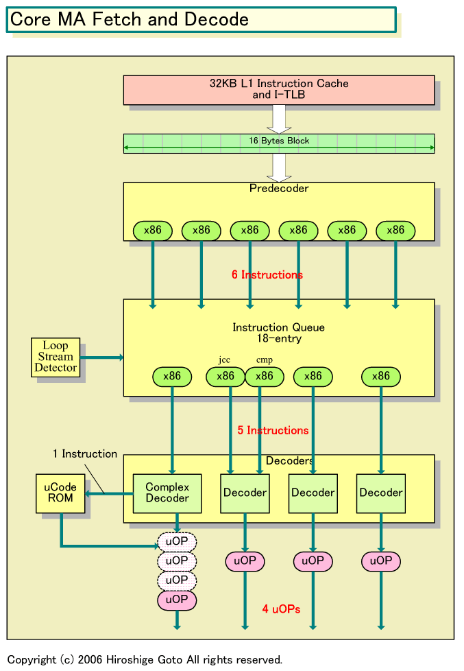 그것이 보이는 것은 Nehalem에서 구현된 uOPs 기반 "루프 스트림 디텍터 (Loop Stream Detector)"다. Core MA부터 편입된 루프 스트림 디텍터는, 루프를 감지하면 루프 내의 명령을 최대 18 명령까지 캐쉬한다. 실제로는 루프의 경우, 프리 디코더 아래의 명령 큐에 저장한 명령을 플러시 (버리지) 않고서 유지하며, 반복 실행한다. 따라서 Core MA에서는 루프 내의 명령은 다시 페치 & 프리 디코드 할 필요가 없다.