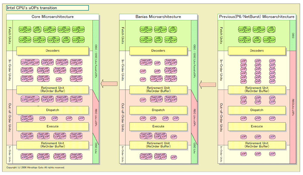 그러나 아마 이것은 모두 옳지 않다. Core MA는 명확하게 P6이나 NetBurst (Pentium 4)와는 다른 사상을 가지고, 마이크로 아키텍처가 근본적으로 혁신되어 있기 때문이다. 그것을 상징하는 것은, 내부 명령 (Micro Operations : uOPs)의 아키텍처다. Core MA와 NetBurst에서는, 이것이 근본적으로 다르기 때문에, 파이프 라인의 구조가 완전히 다르게 되어 있다.