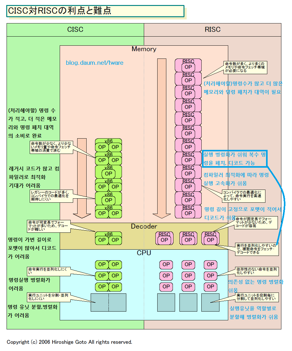 예전 PC잡지 에서 CISC와 RISC를 쉽게 설명을 할 때 다음과 같은 식으로 설명을 했던 것 같네요. 철수야 개똥이네 집에가서 물건을 받아서 영희네 집에 주고 오렴 이라고 명령을 내리는게 CISC CPU. 철수야 개똥이네 집에 가라, 물건을 받아라, 영희네로 가라, 물건을 주고 와라 이런식으로 명령을 내리는게 RISC, 라구요.)