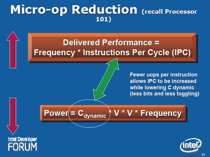 "Micro-Fusion에서는 CISC 명령(의 변환)을, 보다 복잡한 포맷의 uOPs로 지켜, 적은 uOPs 수를 유지한다. 이에 따라서, C dynamic (동적 캐퍼시턴스)를 낮게 유지하고, 소비 전력을 억제한다"
