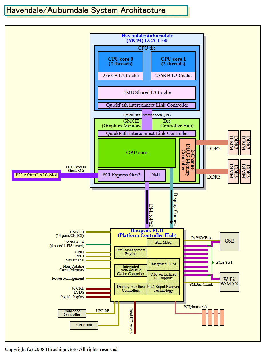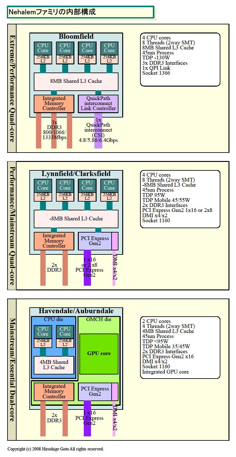 특히 성능면에서 영향이 큰 것은, Nehalem 패밀리의 상위 및 하위에서 구현에 큰 차이가 있는 점이다. 상위의 Nehalem은 CPU에 온다이 (On-Die)로 노스 브릿지 (MCH) 기능을 통합하고 있으며, 따라서 저 레이턴시 메모리 액세스나 광대역 메모리를 실현할 수 있다. 반면 하위의 GPU 코어 통합판의 듀얼 코어 CPU "Havendale / Auburndale (헤븐데일 / 오번데일)"은 현재 판명된 바로는, 패키지상에 CPU 코어와 노스 브릿지 (GMCH) 코어를 QuickPath Interconnect (QPI)로 접속되어 있다. 온 패키지의 접속이므로 광대역 액세스가 가능하지만, 온다이 통합에 비하면 레이턴시나 소비 전력에서는 불리하다. Nehalem의 성능 업의 어느정도의 부분이, 노스 브릿지 (MCH)의 통합에 의한 것이라고 하면, 하위 Nehalem에서는 그 혜택은 옅어지게 된다.