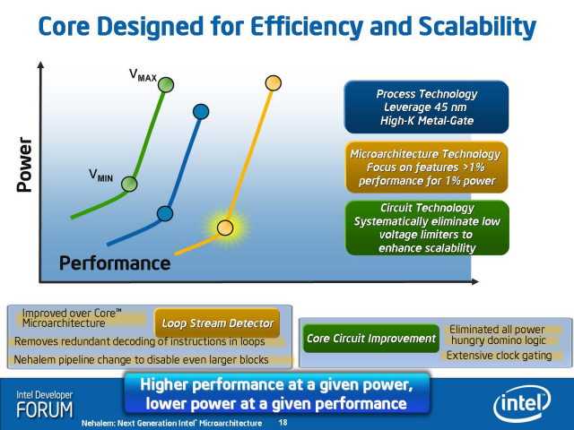 우리는 Silverthorne (Atom 프로세서)에서는 "일대일 전력 효율 (1 for 1 power efficiency)"의 원칙으로 기능을 더했다. 1%의 성능 향상을 1%의 전력 범위 내에서 실현한다는 것이다. 같은 효율을 Nehalem에 편입할 기능에 대해서도 추구했다. 즉, 1%의 전력과 (트랜지스터) 비용마다, 적어도 1%의 성능 향상을 얻을 수 있는 눈부시게 전력 효율이 좋은 기능만을 Nehalem에 선택했다 "