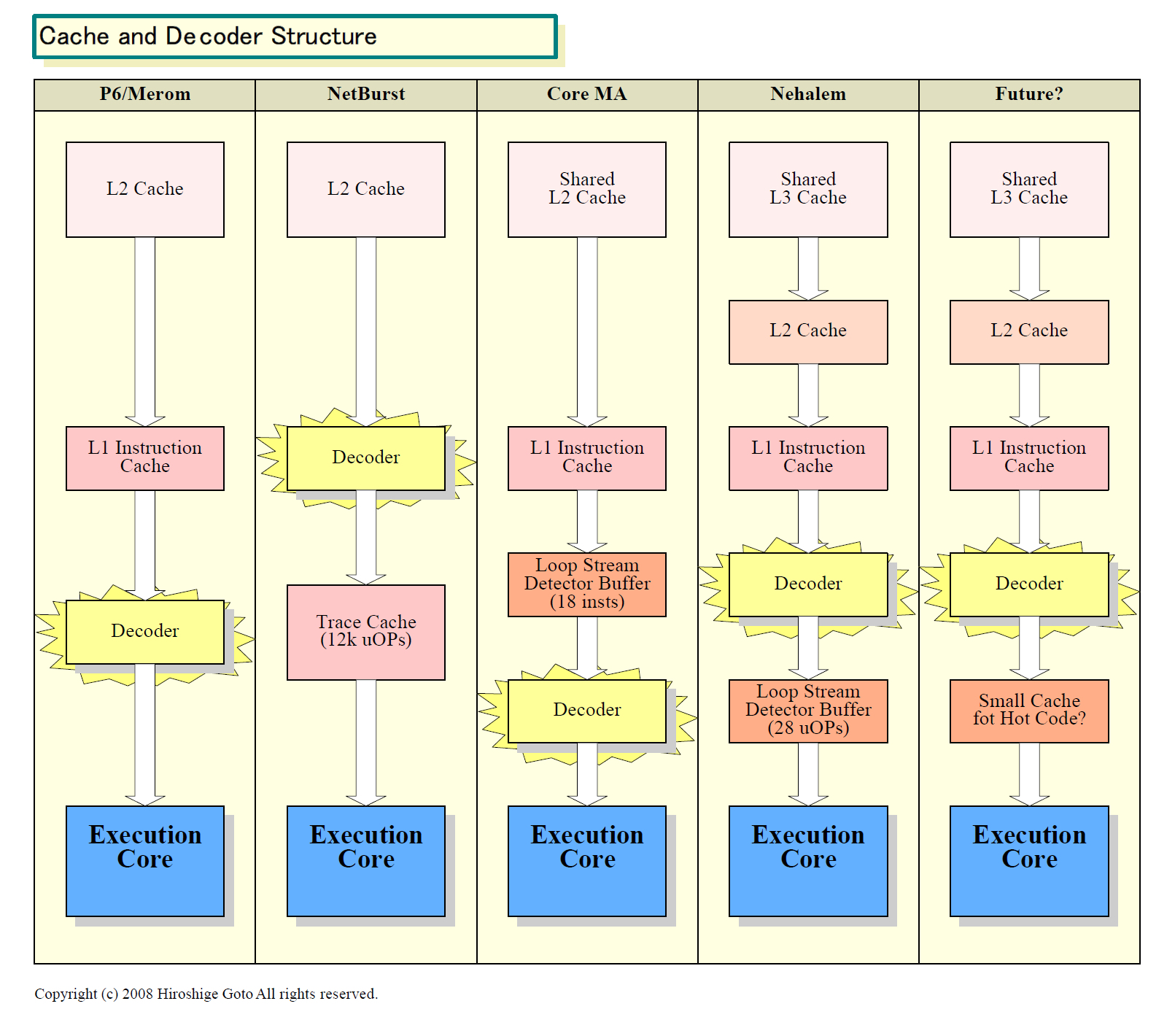 따라서 x86 CPU의 경우는, 명령어 캐시부터 x86계 명령을 효율좋게 반출해서, 내부 명령 (uOPs)으로 효율 좋게 변환하는 것이, 성능 향상에 중요한 과제가 된다. 특히 CPU 내부의 실행 파이프 라인의 병렬도를 높이려고, 하면 프론트엔드 병목이 되기 쉽다. 최대 4명령 병렬과 내부 병렬도가 높은 Core MA / Nehalem에서는, 이 문제는 특히 크다. AMD의 CTO에서 사직을 전한 Phil Hester (필 헤스터)씨도 "4 명령을 실행하기 보다, 4명령을 디코드 하는 쪽이 어려울 것이다"라고 말했다.