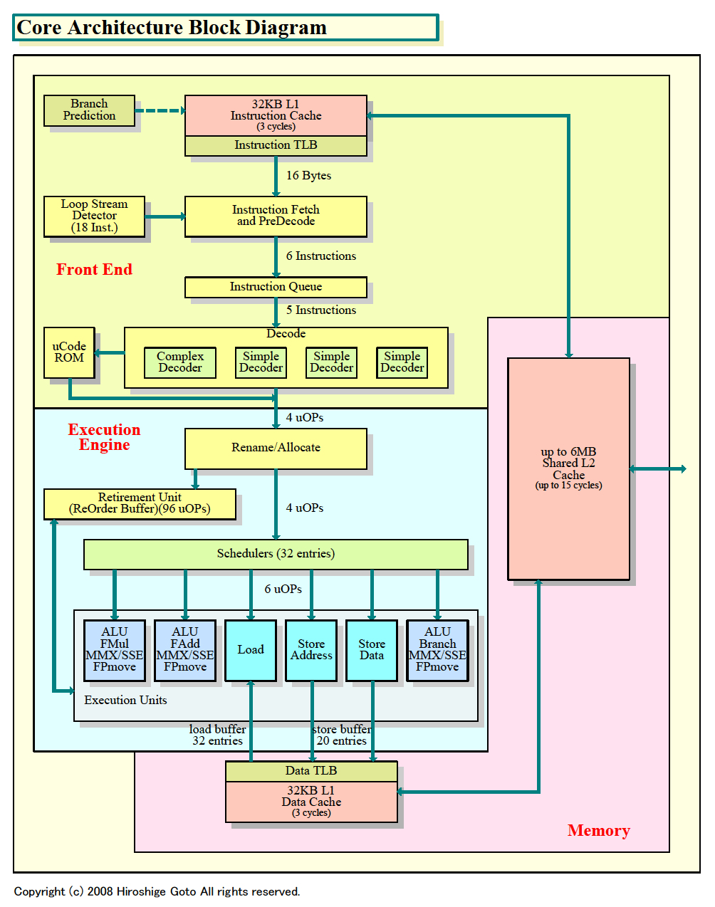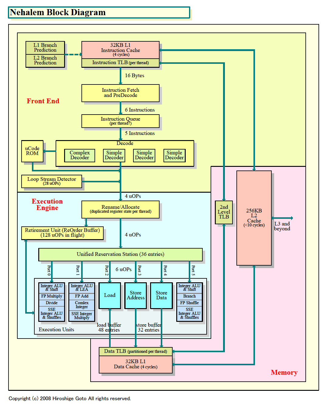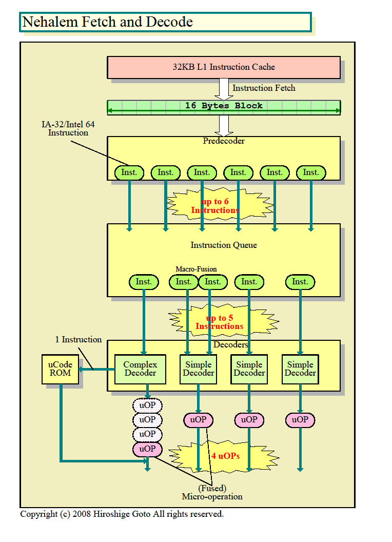 그러나 결론부터 말하면, Nehalem의 명령 디코더 부분은, 64bits 모드에서 Macro-Fusion이 가능하게 된것 이외에는, 본질적으로 거의 개량되지 않았다. 정확하게 말하면, 문제의 본질적인 부분에는 손을 대지 않고, 문제를 회피하는 테크닉 (uOPs 기반 루프 스트림 디텍터)이나 그 이외의 부분에서 성능을 끌어 올리는 테크닉이 담긴 정도였다.