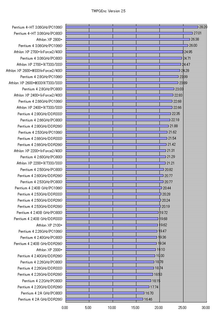 그래프 8 TMPGEnc Version 2.57에서 HT 기술의 유효 · 무효, 심지어 TMPGEnc 설정에서 멀티 스레드를 활성화 · 비활성화 된 결과 다. 멀티 스레드 켜져 비교하면 HT 기술을 활성화 한 경우 32.2 프레임 / 초를 실현하고 있지만, HT 기술을 해제 한 경우에는 25 프레임 / 초로되어 성능 향상 비율은 실로 28.8 %가 된다.