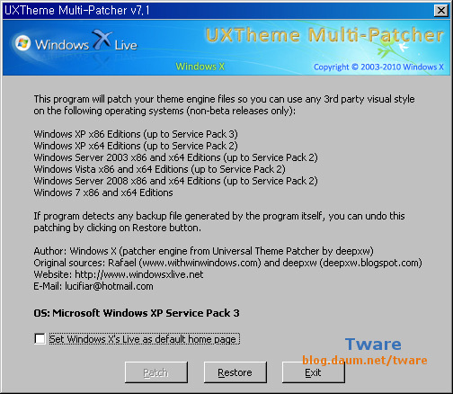 윈도우 테마 패처 7.1버전 입니다. 최신 버전의 경우 8버전 이상이 나와 있는데, XP 컴퓨터에서 설치하고 컴퓨터를 지속적으로 사용하다 보면 테마가 풀린 채로 부팅되는 경우가 종종 생깁니다 (체감상 1주일에 1-2번 정도. 테마를 다시 더블 클릭하면 재 적용 되기는 하지만). 7.1의 경우는 딱히 풀리는 일 없이 외부에서 만든 테마들이 잘 적용 됩니다. 첫번째 Patch(패치)버튼을 눌러서 적용해 주시고, Exit 누르고, 윈도우즈 재시작을 하면 여러가지 테마를 적용할 수 있습니다.