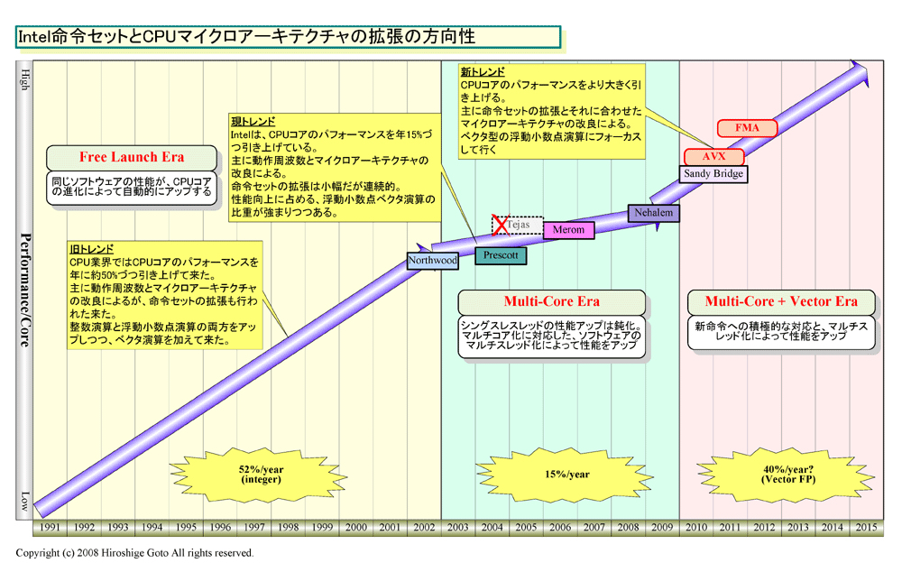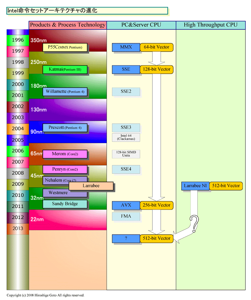 이런 눈으로 보면, 내년 (2009 년) 이후의 Intel CPU의 명령 세트 아키텍처의 괴리의 사정도 추측이있다. 2010 년에는 Intel의 메인 스트림 x86 CPU는 256-bit 벡터 AVX 명령어 확장, 높은 처리량 CPU는 512-bit 벡터의 LNI 확장으로 나뉘어 버린다. 조금 분열증 기미. 벡터 확장 두 계통이 평행 비정상적인 사태가 된다. 그러나 이것이 Intel의 2 개의 개발 센터 간의 경쟁의 결과라고 하면 상황이 보인다.