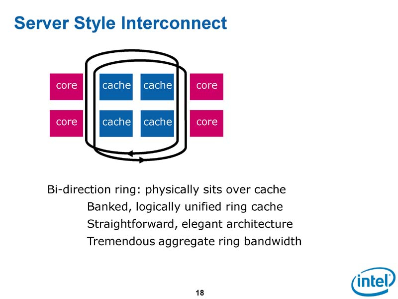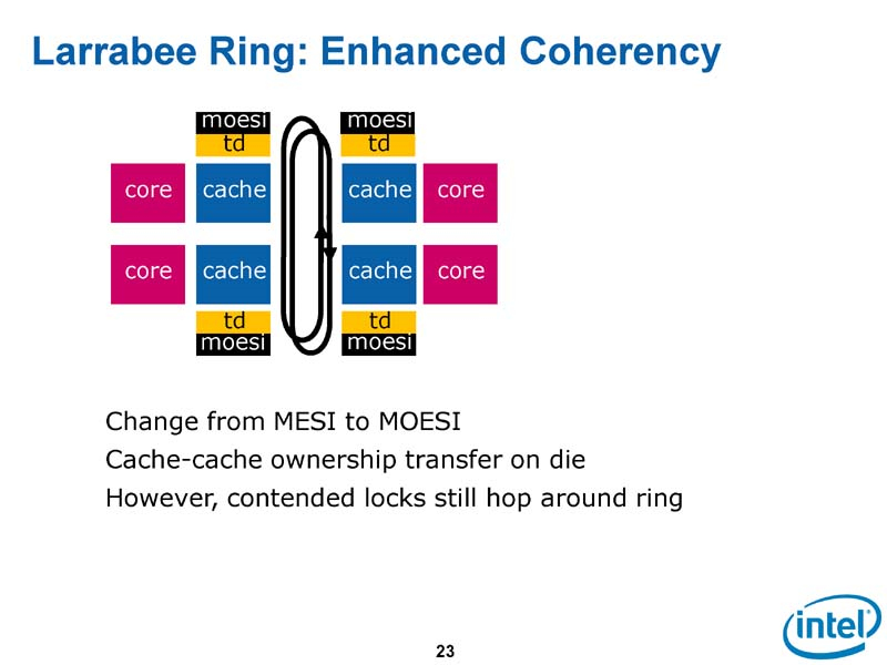 또한 Intel은 캐시 사이의 데이터 전송 트래픽을 줄이기 위해 캐시 일관성 프로토콜을 확장했다. 표준 "MESI"에 Owned 스테이트를 더한 "MOESI"프로토콜을 구현했다. 캐시 라인의 소유권을 직접 마이그레이션 할 수 있도록 함으로써 트래픽을 경감 했다고 한다.